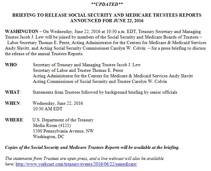 The Social Security Trustees will release their annual report on Wednesday, June 22 at 10:30 a.m. Eastern time.